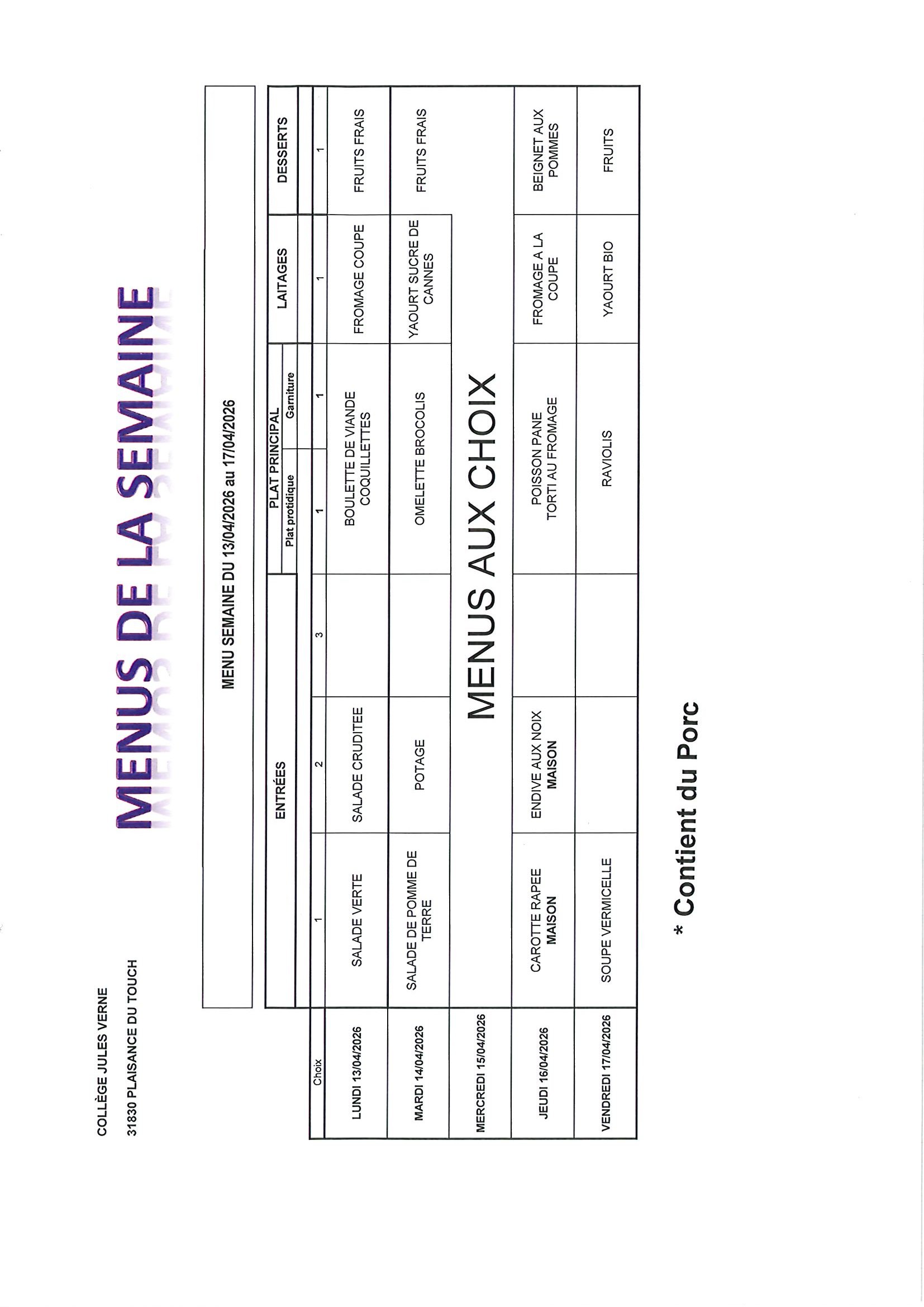MENUS DU 13 AVRIL AU 17 AVRIL 2026