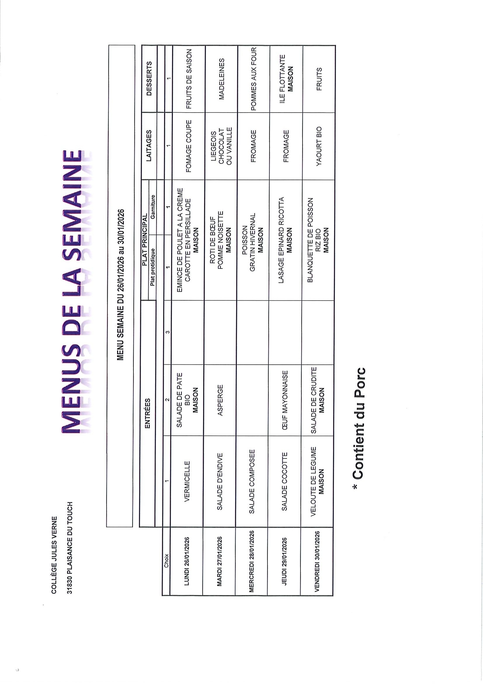 MENUS DU 26 JANVIER AU 30 JANVIER 2026