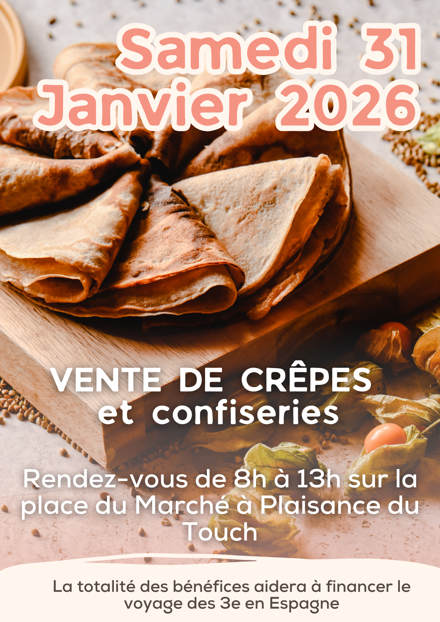 Echange scolaire avec l'Espagne/// Vente de crêpes et confiseries Samedi 31 janvier 2026 de 8h à 13h Place du marché à Plaisance du Touch